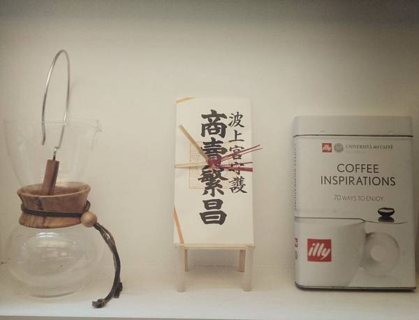 吧檯前的內嵌置物層,放置了許多跟咖啡沖泡器具有關的給溪(台語)