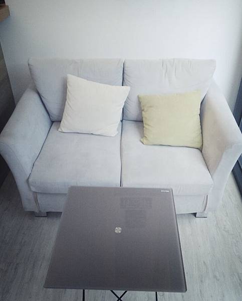 門口一進來的雙人沙發淡淡的灰色讓人感到放鬆
